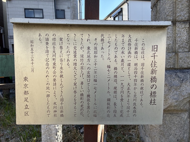 この石柱は、旧千住新橋の親柱である。千住新橋は、明治四十四年から荒川放水路の大改修計画の一環として、大正九年より同十三年までの永い歳月と、119万円を費して完成したものである。橋の構造、規模は、長さ452.7メートル、幅7.2メートル、鋼板桁の近代橋であった。その後昭和三十二年に幅17メートルに拡幅され、東北地方への玄関口として機能を果たしてきたが、堤防の嵩上げ、著しい橋桁の老朽化、さらに交通量の増大などで架け替えをすることとなったのである。架け替えに当り永年親しんできた旧千住新橋の標柱を大川町東町会の要請により、氷川神社の協賛を得て記念のためこの地へ移したものである。
