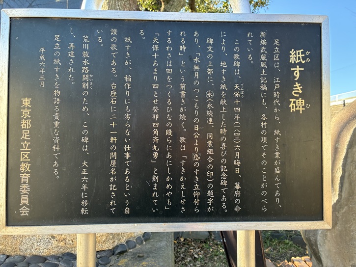 足立区は、江戸時代から、紙すき業が盛んであり、新編武蔵風土記稿にも、各村の項でそのことがのべられている。この歌碑は、天保十四年(1843年)六月晦日、幕府の命により、地すき紙を献上した時の喜びの記念碑である。碑文の上部に、丸永(永続連、同業組合の印)の題字があり、「水無月のつこもりの日公より?(岱?)のすき立仰付られる時」という前書きが続く。歌は「すきかえしせきするわさは田をつくるひなの賤らにあにしかめやも」「天保十あまり四とせ癸卯四角斉丸勇」と刻まれている。紙すきが、稲作りにも劣らない仕事であるという自賛の歌である。台座石に二十一軒の問屋名が記されている。荒川放水路開削のため、この碑は、大正六年に移転し、再建された。足立の紙すきを物語る貴重な資料である。