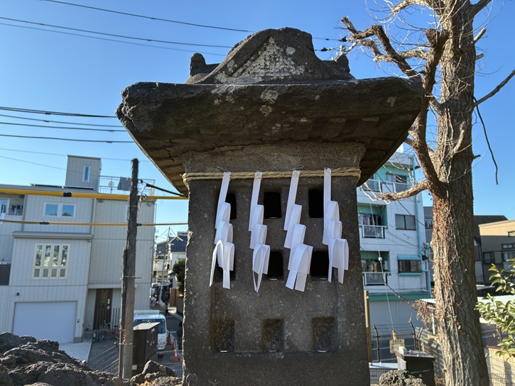 石祠はいくつかあり、文政七年(1824年)のものには、「丸藤惣同行、富士山三十三度大願成就」と記されています。江戸には、富士講が八百八講あったとされ、千住の講は丸藤千住十三夜同行です。丸藤とは、元講の名前で、千住は地名、十三は、食行身禄行者の命日、法行を夜行うということから講名がつけられました。千住の富士講は、享保期から活動が見られ大正九年(1920年)頃に最も活発に行われていました。千住地域には、大川町氷川神社・千住神社・柳原稲荷神社に富士塚があります。