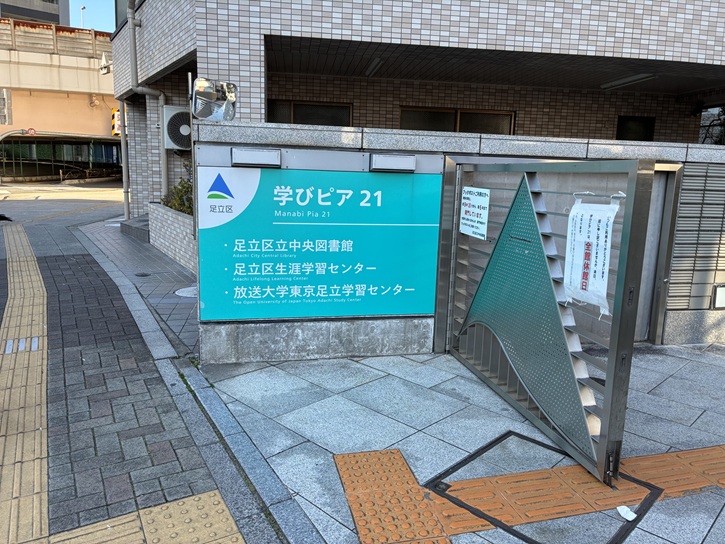 国道4号線の高架下を通った先の荒川の堤防に面した風光明媚な場所に足立区生涯学習総合施設(愛称:学びピア21)が建っています。1〜3階は足立区立中央図書館、4階は足立区環境情報プラザと足立区生涯学習振興公社、4〜5階には足立区生涯学習センター、6階には放送大学東京足立学習センター、7階には地域包括支援センター「千住本町」が併設されています。学びピア21は、あらゆる世代、あらゆるニーズに合った生涯学習が提供できる施設となっています。生涯学習センターでは、区内13の生涯学習施設の基幹施設として、高度で専門的な学習をはじめ、暮らしに役立つ学習、様々な学習情報の提供など、区民ニーズや社会的な課題に対応した多様な生涯学習を実施しています。