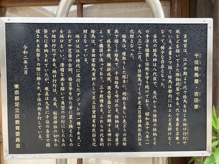 吉田家は、江戸中期より代々絵馬をはじめ地口行灯や凧などを描いてきた際物問屋である。代々東斎を名乗っている。手書きで描く絵馬は都内にほとんど見掛けなくなって、稀少な存在となった。当代の絵馬師は八代目で、先代からの独特の絵柄とその手法を踏襲し伝統を守り続けており、昭和五十八年(1983年)十二月、千住絵馬づくりが足立区登録無形民俗文化財となった。絵馬は、縁取りした経木に、胡粉と美しい色どりの泥絵具で描く小絵馬で、千住絵馬と呼ばれる。絵柄は、安産子育、病気平癒、願掛成就、商売繁盛など祈願する神仏によって構図が決っており、三十数種ある。これらの代表的絵馬は、吉田家絵馬資料として足立区登録有形民俗文化財となっている。地口は江戸時代に流行したダジャレの一種である。ことわざや芝居の台詞、格言等を似た音に置き換えたものを地口といい、滑稽な画を描いて角型の行灯にしたものが地口行灯である。地口行灯は、元来、稲荷神社の初午の祭礼に奉納されていたが、現在は九月に千住の各宮で開催される秋祭りの際に飾られ、千住の街を灯している。