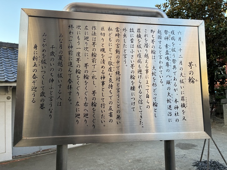 六月・十二月の大祓いに罪穢を又疫病を祓う祭具であるが、本神社の祭神素盞鳴尊の八頭の大蛇退治に起因すると言われている。即ち茅の輪は、大蛇を形どって輪とし、これを潜り越える事によって自らの罪穢を祓い疫病も避けられると信じてきた。故に昔は小さい茅の輪を腰につけて外出したと言う。當時の言動の中で絶対と言うことの無い私どもにとって敬虔な気持ちでの反省の区切りと魂を清める神事として行いたい。作法は茅の輪前で一礼し、茅の輪をくぐり左に廻り次に、茅の輪をくぐり右へ廻り、次にもう一度茅の輪をくぐり、左に廻り終わって神前に進んで参拝する。