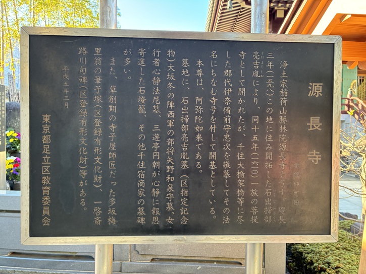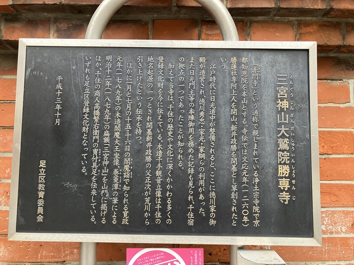 「赤門寺」という通称で親しまれている浄土宗寺院で京都知恩院を本山とする。寺伝では文応元年(1260年)勝蓮社専阿上人を開山、新井政勝を開基とし草創されたという。江戸時代に日光道中が整備されると、ここに徳川家の御殿が造営され、徳川秀忠・家光・家綱らの利用があった。また日光門主等の本陣御用を務めた記録も見られ、千住宿の拠点の一つであったことが知られる。加えて当寺は、千住の歴史や文化に深くかかわる多くの登録文化財を今に伝えている。木造千手観音立像は千住の地名起源の一つとされ開基新井政勝の父正次が荒川から引き上げたという伝承を持つ。ほかに一月と七月の十五・十六日の閻魔詣で知られる寛政元年(1789年)の木造閻魔大王坐像、巻菱潭の筆による明治十二年(1879年)の扁額「三宮神山」を山門に掲げるほか、千住の商人高橋繁右衛門の冑付具足を伝来している。いずれも足立区登録文化財となっている。