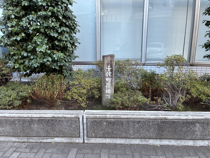 東京芸術センターのひとつ北側の裏通りに、「千住町役場跡」の石碑が建っています。現在は「あだち産業センター」になっていますが、かっては旧足立区役所の敷地の一部でした。