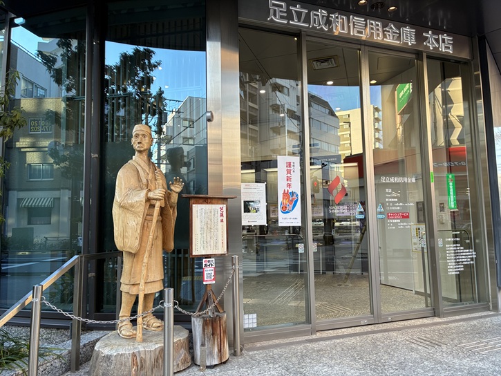 足立成和信用金庫の店頭に芭蕉像が立っています。