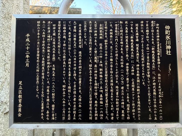 地名を冠して仲町氷川神社とも称される氷川神社は、延喜年間(901年〜923年)に創建されました。元々は現在地よりも南東の牛田寄の元宮という所に里人が勧請しましたが、その後に荒廃していました。慶長三年(1598年)に石出掃部介義胤がこの地を支配し、元和二年(1616年)に荒川水除堤を作る時に、この神社の土地がその敷地にあたるために、現在地に遷座し、社殿を建てると共に、改めて武蔵国一の宮氷川神社の御分霊を勧請してこの地の鎮守としました。案内板にある「戊戌年」とは、西暦年を60で割って38が余る年をいいます。