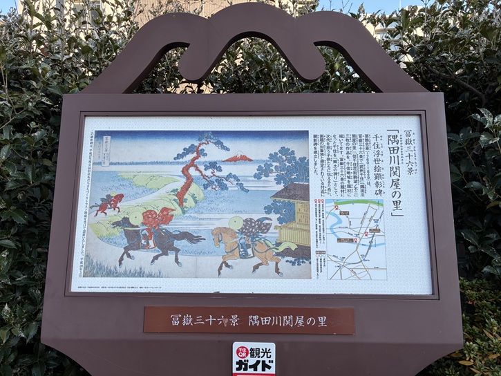 公園の入口の脇に、葛飾北斎が描いた冨嶽三十六景で千住地域を画題にした3枚のうちの1枚「隅田川関屋の里」の顕彰碑が立っています。オランダ商館の医師としてシーボルトが来日した当時、日本の絵師は幕府の許可なしに外国人のために絵を創作することは国禁になっていましたが、葛飾北斎(1760年〜1849年)は文政九年(1826年)に「日本風俗画」15枚を描きました。シーボルトは出版した自著「Nippon」の挿図に「北斎漫画」の図柄を用いました。1867年のパリ万国博覧会で浮世絵が紹介され、その奇抜で動的な構図・軽妙な人物の動き・その表情・衣装描写の精緻さがヨーロッパの芸術家たちに驚愕を与えました。北斎に影響を受けた画家には、ビンセント・ヴァン・ゴッホやエドガー・ドガなどがいて、ドガは「北斎漫画」を参考にした人物像を描いています。また、アンリ・リヴィエールは、「冨嶽三十六景」に触発されて「エッフェル塔三十六景」を描きました。音楽家のクロード・ドビュッシーも「冨嶽三十六景 神奈川沖浪裏」に発想を得て、交響詩「海」を作曲したとされています。このようにしてヨーロッパの芸術家に大きな影響を与えた北斎は、世界的に評価が高く、1960年にはウィーンで開催された世界平和評議会において、世界の文化巨匠として顕彰され、また、1999年にはアメリカの雑誌「ライフ」で「この1000年でもっとも偉大な業績を残した100人」として、日本人でただ一人選ばれています。