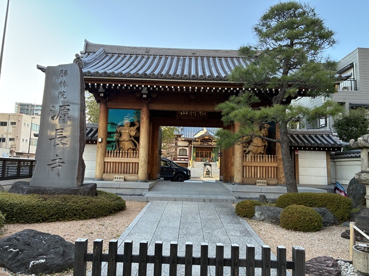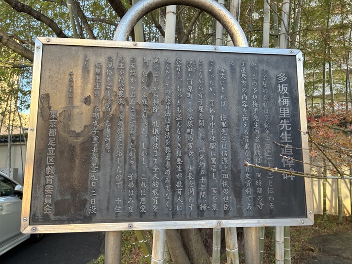 徳多和良の直ぐ先にある勝専寺(しょうせんじ)は、山門の色が赤いことから別名「赤門寺」と呼ばれています。勝専寺は、新井政勝により元仁元年(1224年)に開基されました。寺名は開山の勝蓮社専阿が由来となっています。新井政勝の父である新井政次が荒川(現在の隅田川)に網を投じたところ、千手観音像が網にかかったのが寺の由緒だといわれています。この千手観音は勝専寺の寺宝となっていて、地名「千住」の由来ともいわれています。江戸時代は、鷹狩のために訪れた江戸幕府の将軍のみならず、日光例幣使や輪王寺門跡の休憩所や宿泊施設の役割を果たしました。境内には明治時代に再建された鐘楼があり、再建に際して時の鐘が聞こえる南足立・南葛飾・北豊島の三郡から資金を募ったとのことです。その側壁に記念の碑文がはめ込まれていますが、題字の「鐘楼建築記念碑」は日本亡命中の朝鮮国の政治家金玉均の筆になるものです。