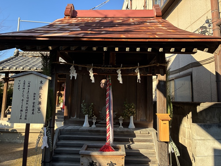 関屋天満宮は、神社本殿左側に社殿がある境内社のひとつである。「新編武蔵風土記」に「天神社 小名関屋ニアリシ社ヲ移セリ。故二鳥居二関屋天満宮ト扁ス。神体菅公ノ像ヲ安ス」 とある。関屋から移転した時代は不明である。文化四年(1807年)建立のこの碑は、裏面に一啓斎路川の門人たちが造立したことが記され、路川書の和歌が刻まれている。両側面には、月ごとの梅の姿を詠んだ漢詩も刻まれているが、作者は不明である。昭和五十七年十二月に区登録有形文化財(歴史資料)となった。