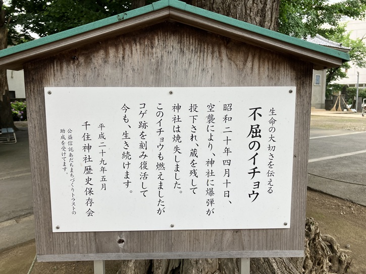 昭和二十年四月十日、空襲により、神社に爆弾が投下され、蔵を残して神社は焼失しました。このイチョウも燃えましたがコゲ跡を刻み復活して今も、生き続けます。
