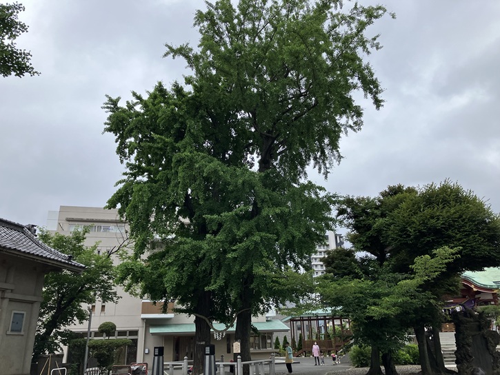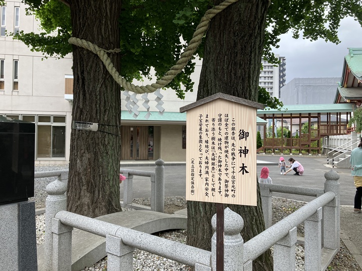 この銀杏は、先の戦争にて千住宮元町のほぼ全ての建物が焼失した中で、御祭神御守護のもと、焼け残った御神木であります。寄り添う樹木は「夫婦銀杏」として親しまれており、縁結び、夫婦円満、家内安全、子宝安産の象徴となっております。