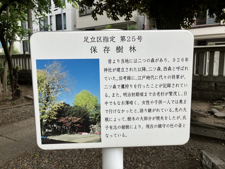昔より当地には二つの森があり、926年神社が建立された以降、二ツ森、西森と呼ばれていた。旧考録に、江戸時代に代々の将軍が、二ツ森で鷹狩りを行ったことが記録されている。また、明治初期頃まで古老杉が繁茂し、日中でもなお薄暗く、女性や子供一人では奥まで行けなかったと、語り継がれている。先の大戦によって、樹木の大部分が焼失をしたが、氏子有志の植樹により、現在の鎮守の杜の姿となっている。