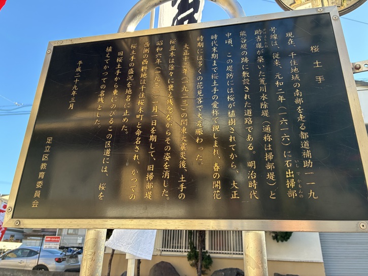 現在、千住地域の南部を走る都道補助119号線は、従来、元和二年(1616年)に石出掃部助吉胤が築いた荒川水除堤(通称は掃部堤)と熊谷堤の跡に敷設された道路である。明治時代中頃、この堤防には桜が植樹されてから、大正時代末期まで桜土手の愛称で親しまれ、春の開花時期には多くの花見客で大変賑わった。大正十二年(1923年)の関東大震災後、土手の桜並木は徐々に衰え残念ながらその姿を消した。昭和六年(1931年)一月一日を期して、旧掃部堤西側の西耕地は千住桜木町と命名され、かつての桜土手の盛況を地名に止めた。旧桜土手から東にのびるこの区道には、桜を植えてかつての名残とした。