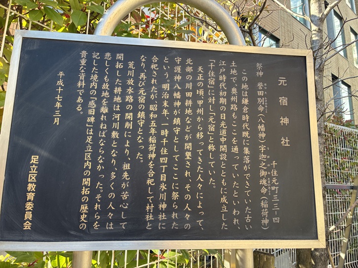この地は鎌倉時代既に集落ができていた古い土地で、奥州路もここを通っていたといわれ、江戸時代初期の日光道中開設とともに成立した「千住宿」に対し「元宿」と称していた。天正の頃、甲州から移ってきた人々によって、北部の川田耕地などが開墾され、その人々の守護神八幡神が鎮守としてここに祭られたという。明治末年、一時千住四丁目氷川神社に合祀されたが、昭和五年稲荷神を合祀して村社となり、再び元宿の鎮守となった。荒川放水路の開削により、祖先が苦心して開拓した耕地は河川敷となり、多くの人々は悲しくも故地を離れねばならなかった。それらを記した境内の「感旧碑」は足立区内の開拓の歴史の貴重な資料である。