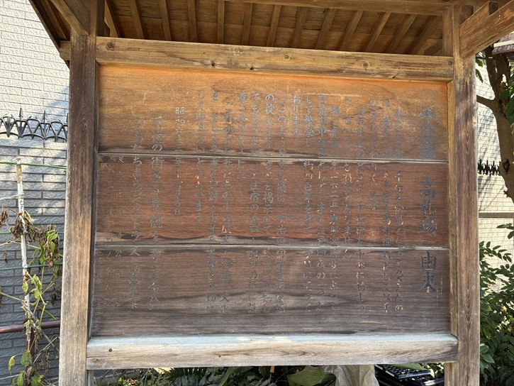 入口の奥には高札場が再現されていて、その由来が記されています。江戸時代には、いろいろな禁制を一般に布達する方法として、高札の制度がありました。各役所からの達しを名主宅の門前や村内の十字路等の高札場に掲げて、庶民に周知徹底を図ったのです。