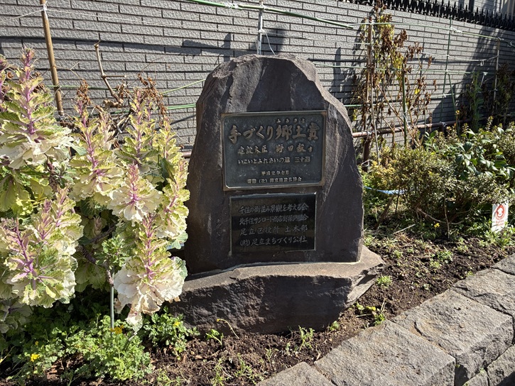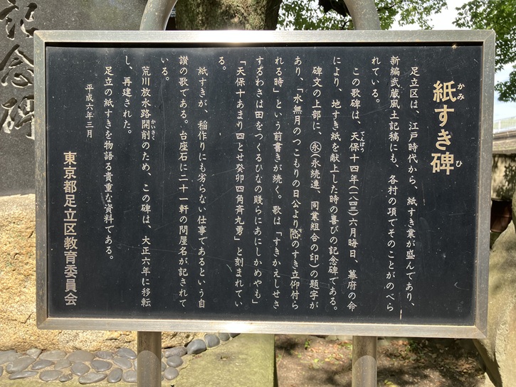 足立区は、江戸時代から、紙すき業が盛んであり、新編武蔵風土記稿にも、各村の項でそのことがのべられている。この歌碑は、天保十四年(1843年)六月晦日、幕府の命により、地すき紙を献上した時の喜びの記念碑である。碑文の上部に、丸永(永続連、同業組合の印)の題字があり、「水無月のつこもりの日公より?(岱?)のすき立仰付られる時」という前書きが続く。歌は「すきかえしせきするわさは田をつくるひなの賤らにあにしかめやも」「天保十あまり四とせ癸卯四角斉丸勇」と刻まれている。紙すきが、稲作りにも劣らない仕事であるという自賛の歌である。台座石に二十一軒の問屋名が記されている。荒川放水路開削のため、この碑は、大正六年に移転し、再建された。足立の紙すきを物語る貴重な資料である。