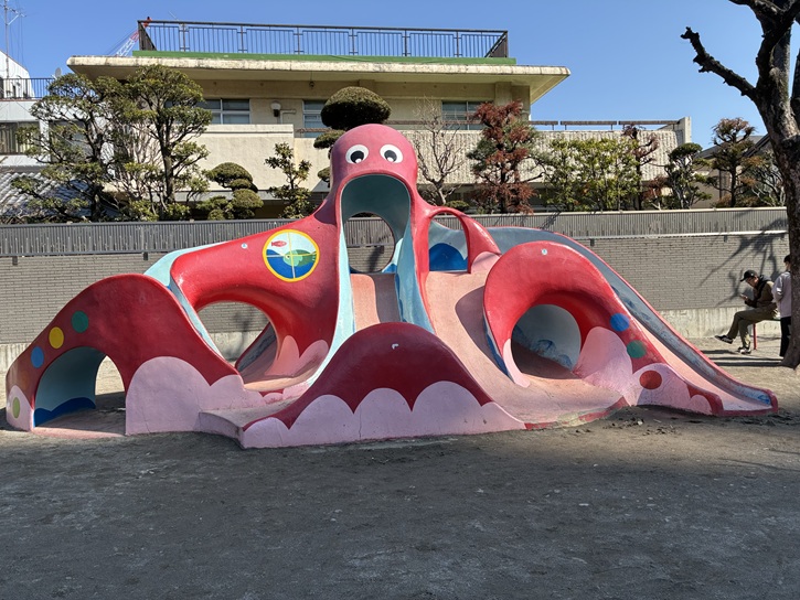 園内には、赤と青でペイントされたタコのすべり台があり、子供たちの人気者となっています。他には複合遊具やブランコもありますが、どれもカラフルな色使いで楽しい気分になります。園内には植栽や植え込みも多く、自然にも触れられる公園です。