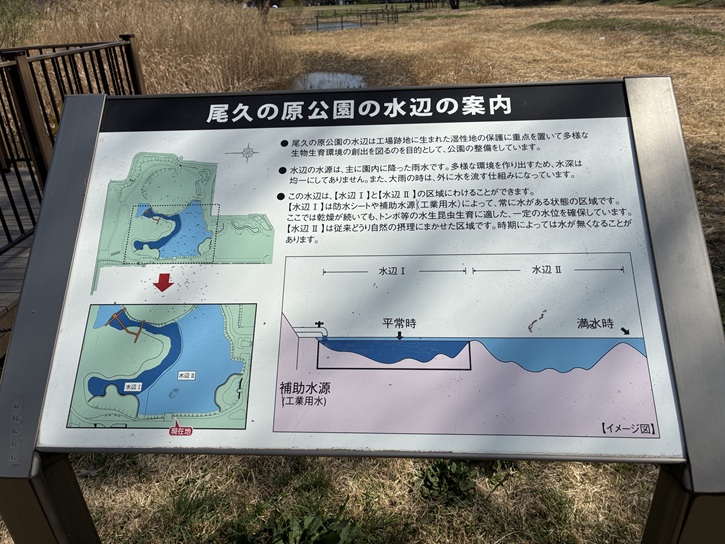 この池は雨が降ると公園内の雨水がたまるようにできています。ためた水はろ過機(右隣りの建物内)によってろ過されて池に戻されます。こうしてろ過された池の水はポンプで送られ、流れの水や水田、畑などの灌水に使われています。また大雨のときには川の増水を少しでもおさえるため、川への排水をとめて池とコミュニティ広場(芝生広場)に雨水をためるという雨水流出抑制の役割もあります。