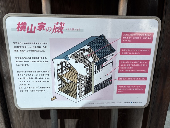 江戸時代に地漉き紙問屋を営んだ横山家(屋号:松屋)には、外蔵2棟と、内蔵、紙蔵、米蔵の、5つの蔵がありました。現在敷地内に残るのは外蔵1棟です。横山家に向かって右側の道沿いに見ることができます。火災のときには扉や窓を閉め、隙間を
