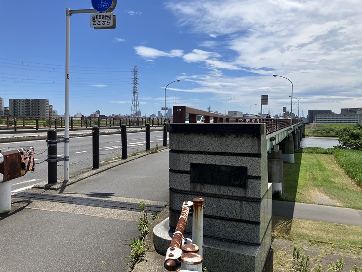 親柱の橋名には「?んぢゆ志んはし」と書いてあるようなないような。隣の石碑には「千住新橋?碑」と書いてあるようなないような。