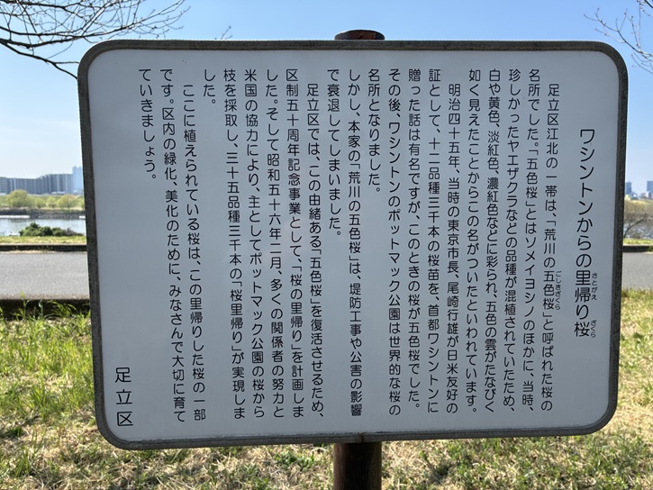 明治四十三年、日本の桜の美しさに感動した体験を持つ当時のタフトアメリカ合衆国大統領夫人をはじめ、多くの方々の尽力により、荒川の五色桜から採取した穂木から育てた苗木が、ワシントンDCポトマック河畔に植樹されました。