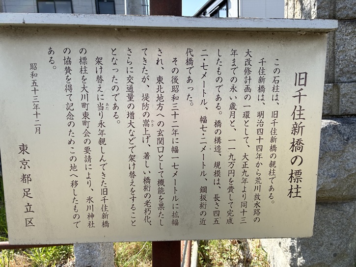 この石柱は、旧千住新橋の親柱である。千住新橋は、明治四十四年から荒川放水路の大改修計画の一環として、大正九年より同十三年までの永い歳月と、119万円を費して完成したものである。橋の構造、規模は、長さ452.7メートル、幅7.2メートル、鋼板桁の近代橋であった。その後昭和三十二年に幅17メートルに拡幅され、東北地方への玄関口として機能を果たしてきたが、堤防の嵩上げ、著しい橋桁の老朽化、さらに交通量の増大などで架け替えをすることとなったのである。架け替えに当り永年親しんできた旧千住新橋の標柱を大川町東町会の要請により、氷川神社の協賛を得て記念のためこの地へ移したものである。
