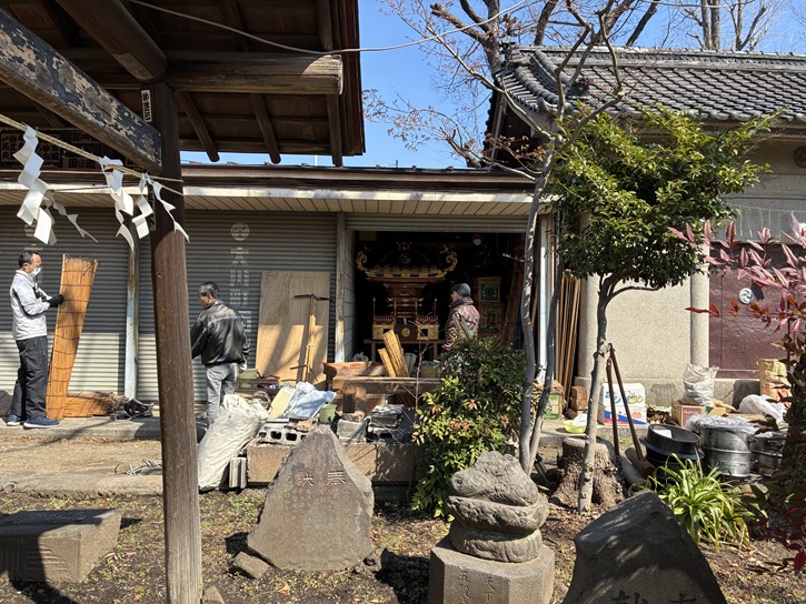 お祭の時期ではないと思いますが、神輿庫の扉が開けられています。例年お正月の元旦に初担ぎの神輿渡御が行なわれます。