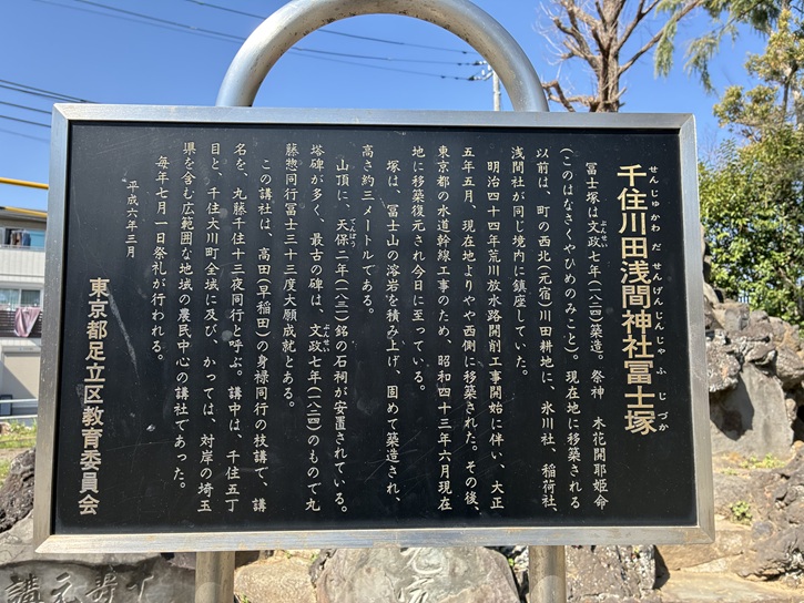 冨士塚は文政七年(1824年)築造。祭神 木花開耶姫命(このはなさくやひめのみこと)。現在地に移築される以前は、町の西北(元宿)川田耕地に、氷川社、稲荷社、浅間社が同じ境内に鎮座していた。明治四十四年荒川放水路開削工事開始に伴い、大正五年五月、現在地よりやや西側に移築された。その後、東京都の水道幹線工事のため、昭和四十三年六月現在地に移築復元され今日に至っている。塚は、冨士山の溶岩を積み上げ、固めて築造され、高さ約三メートルである。山頂に、天保二年(1831年)銘の石祠が安置されている。塔碑が多く、最古の碑は、文政七年(1824年)のもので丸藤惣同行冨士三十三度大願成就とある。この講社は、高田(早稲田)の身禄同行の枝講で、講名を、丸藤千住十三夜同行と呼ぶ。講中は、千住五丁目と、千住大川町全域に及び、かっては、対岸の埼玉県を含む広範囲な地域の農民中心の講社であった。毎年七月一日祭礼が行われる。
