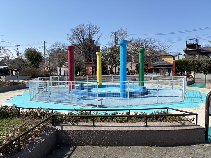 4色の円柱に守られた子どもに人気の丸いじゃぶじゃぶ池は、夏には幼児用のプールになります。暑い日に、無料で安全に水遊びができるスポットとして、多くの親子連れに利用されています。