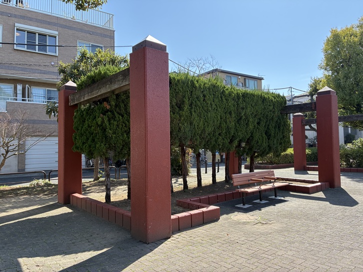 氷川神社の裏門から退出し、住宅地の路地を進みます。路地を進んだ左手に千住公園があります。千住公園は、子供の遊び場が豊富な公園です。園内には遊具・じゃぶじゃぶ池・ボール遊びのできる広場などがあり、広い敷地でのびのびと遊ぶことができます。公園の周囲は煉瓦色のパーゴラで囲まれ、夏には緑の屋根になります。