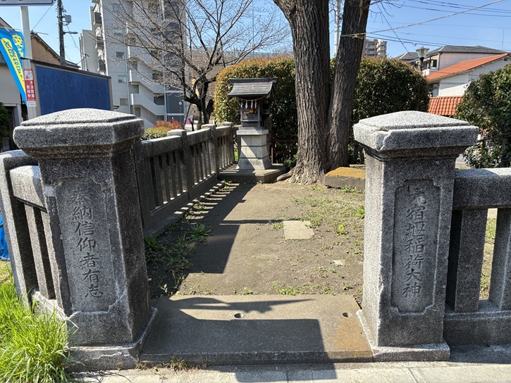 タカラ湯から道なりに進みますと、墨堤通りに出ます。道路の向かい側に元宿堰稲荷神社があります。創建は宝暦四年(1754年)で、昭和二十年(1945年)11月に元宿神社の境内社に編入され、昭和二十二年(1947年)2月に元宿神社から独立しました。旧社名は「千住四本煙突守護社」で、昭和三十九年(1964年)に閉鎖された東京電力千住火力発電所を鎮守する鎮守社として、企業発展の守護者とされています。