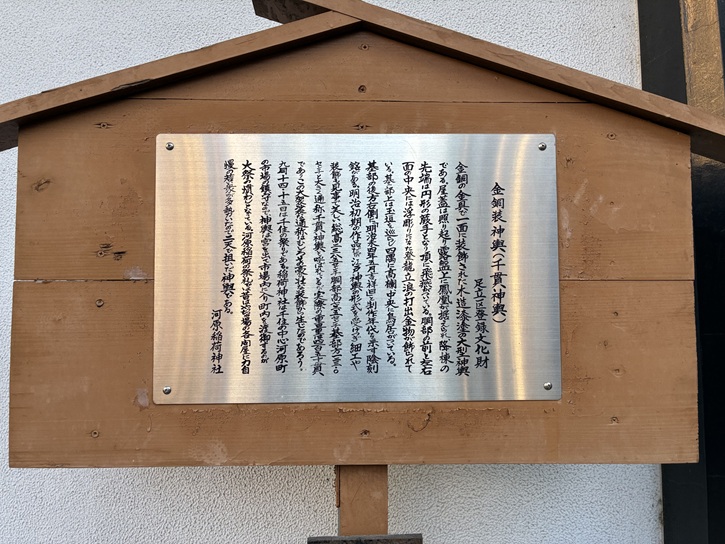 神輿庫に展示されている戦火を逃れた金銅装大神輿は、区の有形文化財に登録されています。「明治未四年」とは、未年(ひつじどし)の明治四年という意味です。