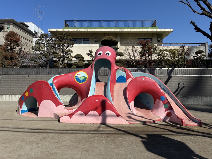園内には、赤と青でペイントされたタコのすべり台があり、子供たちの人気者となっています。他には複合遊具やブランコもありますが、どれもカラフルな色使いで楽しい気分になります。園内には植栽や植え込みも多く、自然にも触れられる公園です。