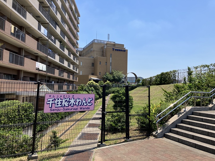 路地を進んだ左手に千住公園があります。千住公園は、子供の遊び場が豊富な公園です。園内には遊具・じゃぶじゃぶ池・ボール遊びのできる広場などがあり、広い敷地でのびのびと遊ぶことができます。公園の周囲は煉瓦色のパーゴラで囲まれ、夏には緑の屋根になります。