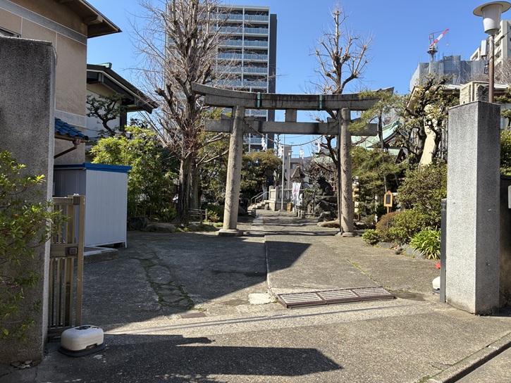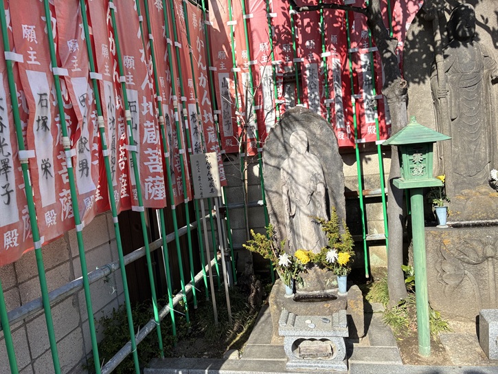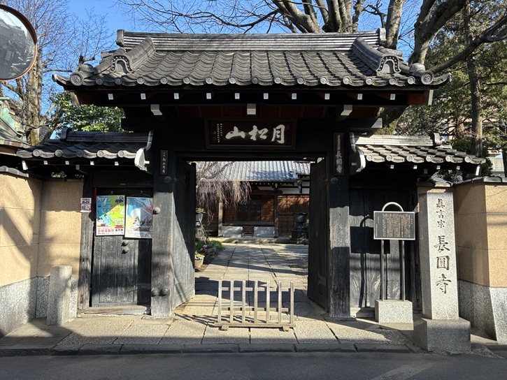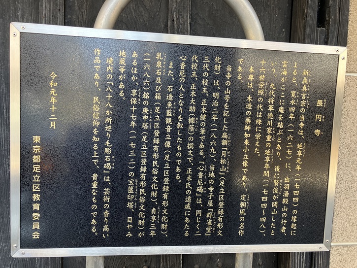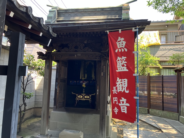 路地の右手に長円寺があります。長円寺は、江戸時代初期に出羽国湯殿山の行者の雲海によって開山されました。雲海が持っていた定朝の作といわれる薬師如来像が本尊で、秘仏となっています。かつての長円寺の境内は広く、山門から一直線に延びる道は、境内の中の参道だったといいます。その参道に沿ってカラタチの生け垣が続いていたことから「からたち寺」の異名を持っています。境内には魚籃観音堂があり、魚籃観音が安置されています。元々は隣の氷川神社の御神体(本地仏)でしたが、明治時代の神仏分離で長円寺に移されました。