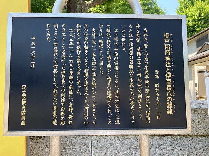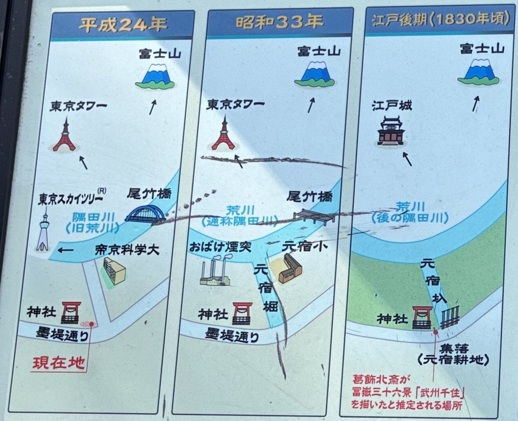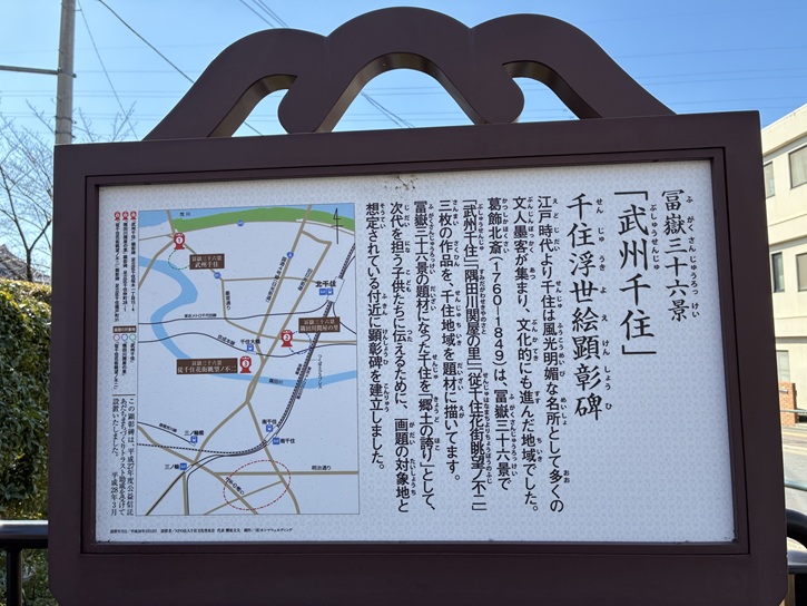 葛飾北斎(1760年〜1849年)は、冨嶽三十六景で「武州千住」「隅田川関屋の里」「従千住花街眺望ノ不二」三枚の作品を、千住地域を題材に描いて(い)ます。冨嶽三十六景の題材になった千住を「郷土の誇り」として、次代を担う子供たちに伝えるために、画題の対象地と想定されている付近に顕彰碑を建立しました。