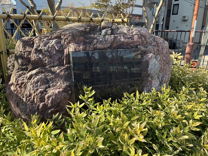 芭蕉像の足下の敷き石は、やっちゃ場のせり場に敷かれていた御影石です。