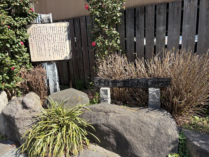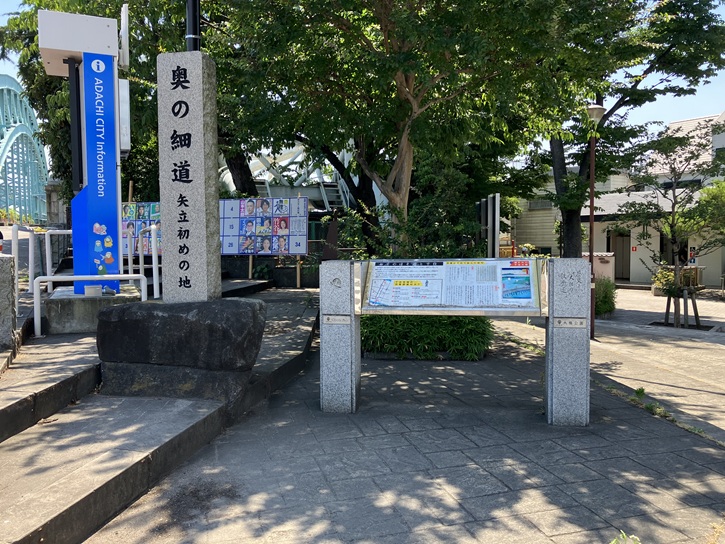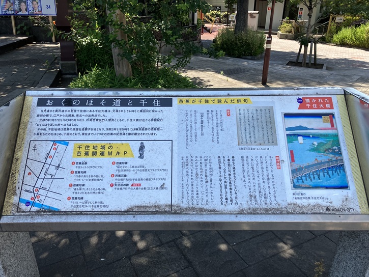 芭蕉と菖蒲園(為成善太郎)の句碑が建っています。芭蕉の句の「鮎の子の白魚送る別れ哉」は、「白魚は、旧暦2月頃に産卵のために川を上る。鮎は、その1ヶ月ぐらい後に遡上すると言われている。芭蕉と曾良を白魚に、千住まで見送りに来た門弟達を鮎に見立てた。」と解釈されます。
