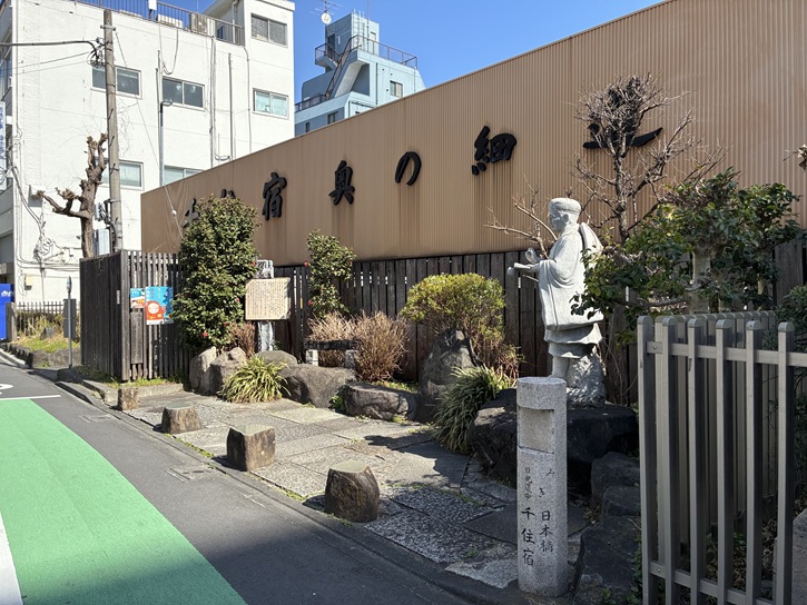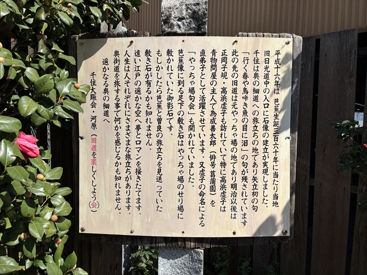 道路脇の狭いスペースですが、松尾芭蕉の石像が建っています。芭蕉と弟子の曽良がこの地から奥の細道の旅へ出立した際に、矢立の句を詠んだ時の様子を表わしています。