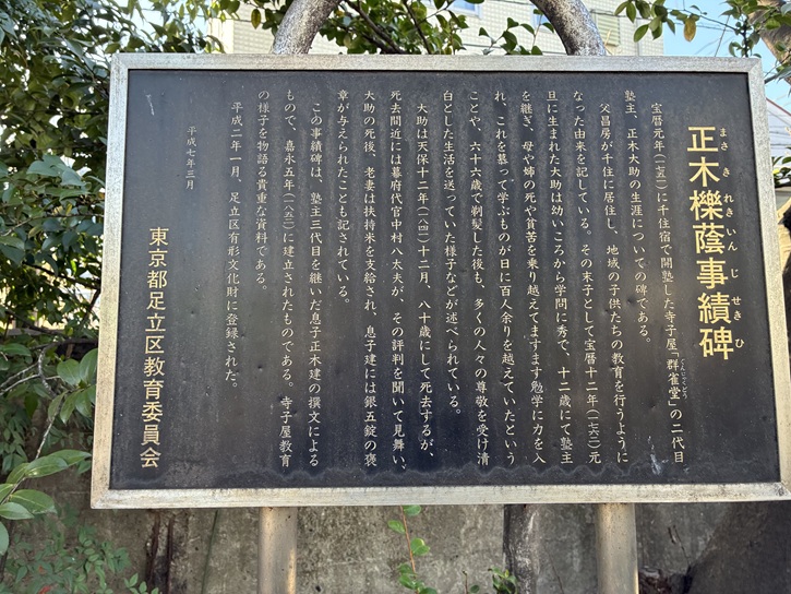 宝暦元年(1751年)に千住宿で開塾した寺子屋「群雀堂」の二代目塾主、正木大助の生涯についての碑である。父昌房が千住に居住し、地域の子供たちの教育を行うようになった由来を記している。その末子として宝暦十二年(1762年)元旦に生まれた大助は幼いころから学問に秀で、十二歳にて塾主を継ぎ、母や姉の死や貧苦を乗り越えてますます勉学に力を入れ、これを慕って学ぶものが日に百人余りを越えていたということや、六十六歳で剃髪した後も、多くの人々の尊敬を受け清白とした生活を送っていた様子などが述べられている。大助は天保十二年(1841年)十二月、八十歳にして死去するが、死去間近には幕府代官中村八太夫が、その評判を聞いて見舞い、大助の死後、老妻は扶持米を支給され、息子建には銀五錠の褒章が与えられたことも記されている。この事績碑は、塾主三代目を継いだ息子正木建の撰文によるもので、嘉永五年(1852年)に建立されたものである。寺子屋教育の様子を物語る貴重な資料である。平成二年一月、足立区有形文化財に登録された。