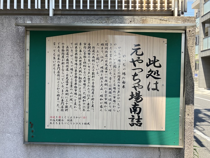 やっちゃ場は多くの問屋のセリ声がやっちゃいやっちゃいと聞こえてくる場所(市場)からきたと言われている。古くは戦国の頃より旧陸羽街道(日光道中)の両側に青空市場から始まり、江戸・明治と続き大正・昭和が盛んだったと聞いている。街道の両側に三十数軒の青物問屋が軒を並べ、毎朝威勢の良いセリ声が響きわたり江戸・東京の市内に青物を供給する一大市場だった。昭和十六年末に第二次世界大戦の勃発により閉鎖となり、以来青果物市場は東京都青果物市場へと変わっていき、やっちゃ場という言葉のみが残った。五街道の奥州街道・日光道中の両側に三十数軒の青物問屋が軒をならべている。まさに専門店街である。日本の専門店街はここから始まった。と言っても良いだろう。