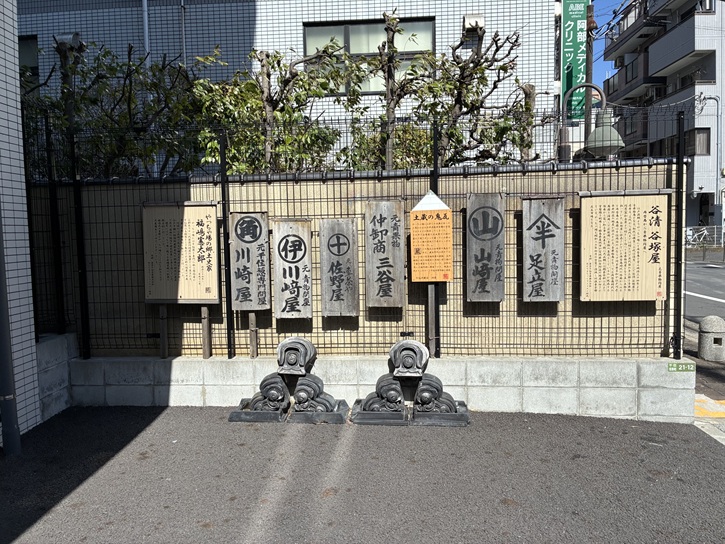 沢山の屋号が書かれた表札の下に鬼瓦が2組置かれています。谷塚屋は、両替商から青果物問屋になった家系です。