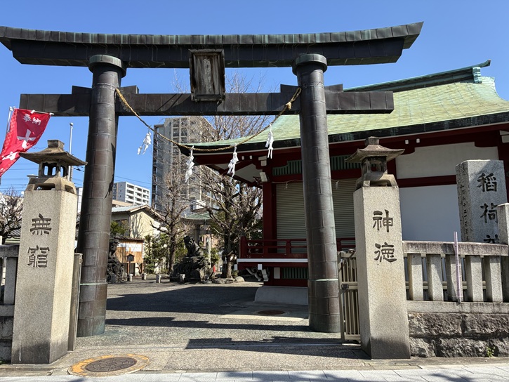 旧日光街道から左手の路地に入ったところに河原稲荷神社があります。路地から入ると、1830年に建立された鳥居が建っています。国道4号日光街道に面した入口にも銅鳥居があり、こちらは1969年に建立されたものです。