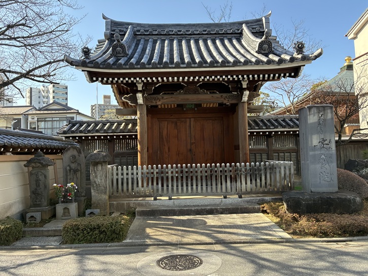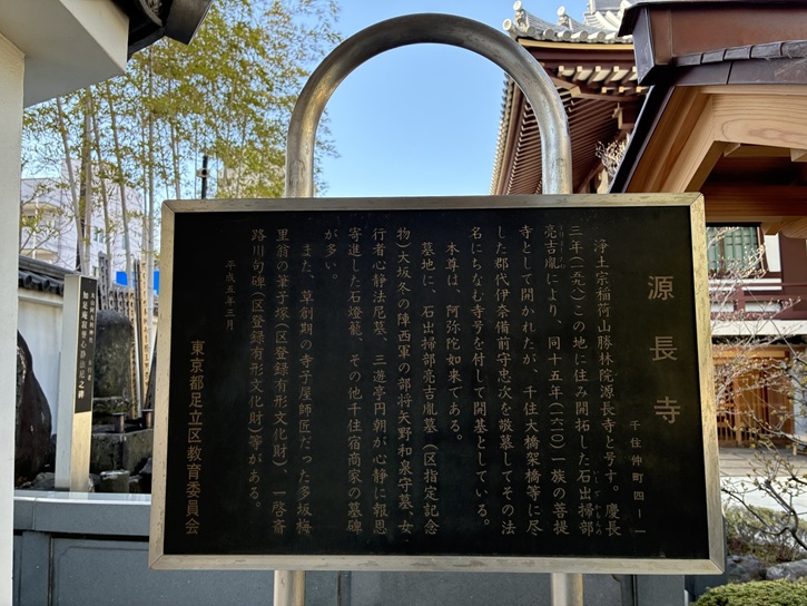 千住宮元町交差点から墨堤通りに入った先に源長寺があります。源長寺は、慶長十五年(1610年)に伊奈忠次が開基となって創立されました。寺名は、忠次の戒名「勝林院殿前備前太守秀誉源長大居士」が由来となっています。しかし、実質的な創建者は千住の開発者であった石出吉胤で、代官頭(後の関東郡代)の忠次に花を持たせる意味で開基の座を譲ったとされています。石出吉胤は、千住開発の功により従五位に任ぜられ、石出家は代々名主を務めることになりました。境内に墓所もあります。