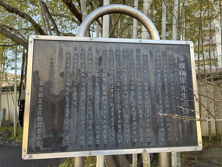 寺子屋の発祥は享保年中(1716年〜1735年)と伝わるが、この多坂梅里先生の追悼碑は、同時期の寺子屋教育の内容を伝える貴重な教育史資料である。碑文によれば、梅里先生は信濃上田侯の世臣であったが、享保年中千住駅に寓居し、医を業としながら寺子屋を開いた。以来約五十年間、掃部宿・河原町・小塚原町の男女、少長を問わず教育し、もっとも盛んなときは塾生が数百人に及んだ。その教育法は書法を教えるのみでなく、職のことから掃除、礼儀作法まで全人的教育をし、たいへん厳しかった。しかし、これは慈愛の至誠から出たことであったから、子弟はみな先生を親愛畏敬しその教えに浴したので、千住の風俗が美しくなったとある。梅里先生は、天明九年(1789年)九月二日没した。