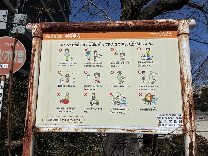 千住本町公園は旧日光街道の宿場通りに面した公園で、かってこの地域は日光街道の宿場町として栄え、その歴史も感じられる公園となっています。