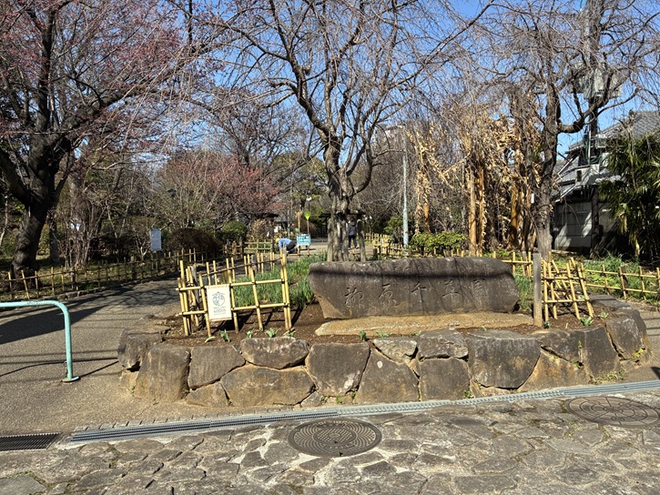 京成関屋駅の先で墨堤通りから離れ、京成本線の高架下を潜って柳原千草園に向かいます。柳原千草園は、隅田川と荒川に挟まれた位置にある区立の公園で、1989年6月4日に開園しました。この地には、かって丸三製紙株式会社千住工場がありました。