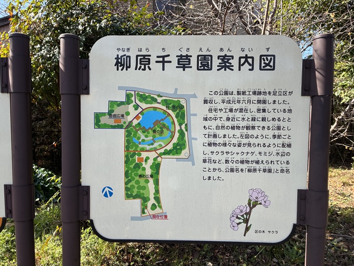 この公園は、製紙工場跡地を足立区が買収し、平成元年六月に開園しました。住宅や工場が混在し、密集している地域の中で、身近に水と緑に親しめるとともに、自然の植物が観察できる公園として計画しました。左図のように、季節ごとに植物の様々な姿が見られるように配植し、サクラやシャクナゲ、モミジ、水辺の草花など、数々の植物が植えられていることから、公園名を「柳原千草園」と命名しました。
