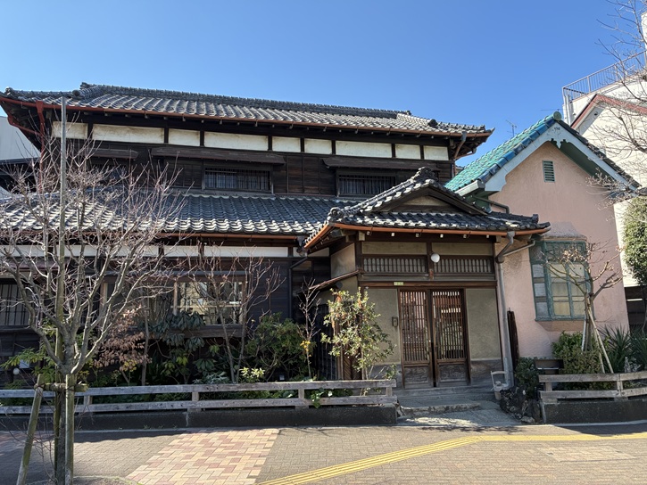 水戸・佐倉街道の標柱の向かいに、昭和十三年築のお屋敷を改装した「和食 板垣」があります。江戸時代から千住に住んでいた旧家の板垣家は、大正時代には農家として現在の荒川の中に位置していましたが(川田耕地)、大正二年の荒川放水路掘削にあたり、現在の千住五丁目に転居しました。その後は荒物屋を開業し、商売を営んでいました。現在の建物は、東京市議会議員を務めた板垣信春氏が昭和十三年に住宅として建てたもので、旧日光街道と旧水戸街道が分岐する位置に現存します。板垣信春氏は、新道の建設に注力し実現に導いたことから、板垣家が面する道は地元では“板垣通り”と呼ばれています。大正期から昭和初期にかけて、和風住宅の一部に洋風の応接間のついた住宅が全国的に建てられましたが、旧板垣家住宅にもその典型的な建築様式が見られます。玄関の格天井や床の間の違い棚・欄間や建具などに繊細な細工がなされ、当時の当主と大工のこだわりが感じられます。令和二年、当時の当主である板垣稔氏が板垣家の相続に際し、建物を残して活用してくれる方への売却を希望しました。幼少の頃から板垣邸を見て育った近藤温思さんが土地・建物を購入し、令和二年(2020年)11月から「和食 板垣」として営業しています。