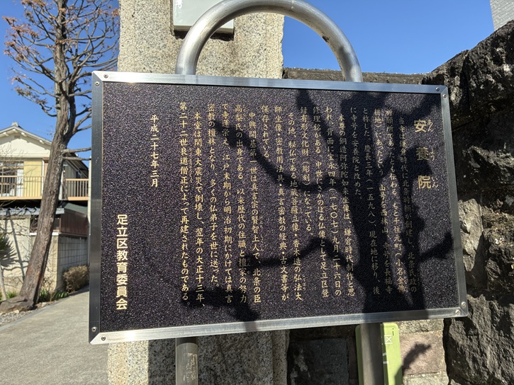 焼き鳥屋さんのはす向かいに安養院があります。安養院は、西林山長福寺安養院と号し、鎌倉時代に北条時頼が創建したと伝えられます。元々は元宿(現在の千住元町)にありましたが、慶長三年(1598年)に兵火で焼失した後、現在地に移転しました。江戸時代、徳川幕府の将軍は鷹狩のために江戸郊外のこの地を度々訪れていて、安養院は「御膳所」(休憩場所)に充てられました。